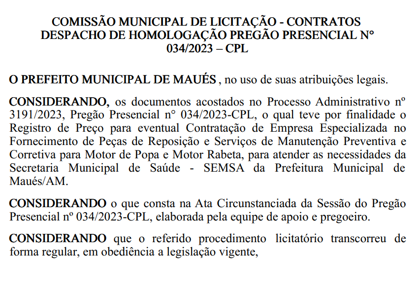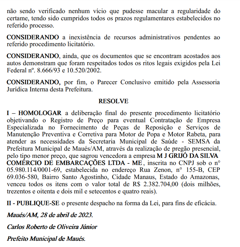 O Despacho de Homologação de nº 034/2023 foi assinado no dia 28 de abril deste ano pelo prefeito de Maués Carlos Roberto, e divulgado apenas na edição desta terça-feira (30).