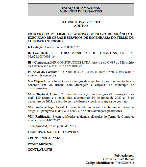 O prefeito de Tonantins, Francisco Sales, prorroga o contrato de mais de R$ 5 milhões de reais para a pavimentação de ruas da cidade. Segundo o Diário Oficial, publicado nesta quarta-feira (14).