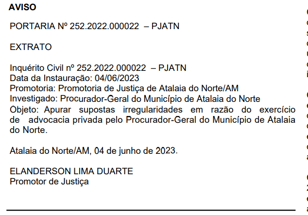 O procedimento investigatório foi instaurado no dia 4 deste mês, pela Promotoria de Justiça de Atalaia do Norte , através do Promotor de Justiça Elanderson Lima Duarte. A portaria do Inquérito Civil, foi divulgada na edição desta quarta-feira (26) do Diário Oficial do MPAM.