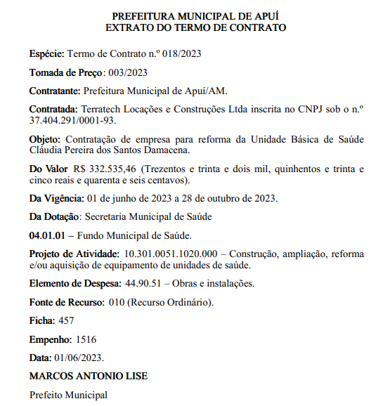 O termo de contrato foi assinado na última sexta-feira (1) pelo prefeito de Apuí Marcos Antonio Lise, e divulgado no Diário Oficial dos Munícipios do Amazonas.