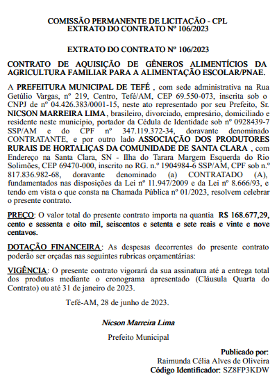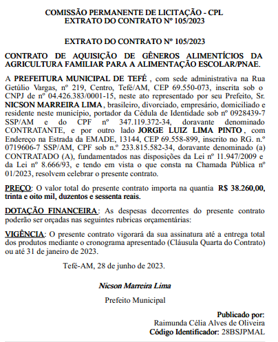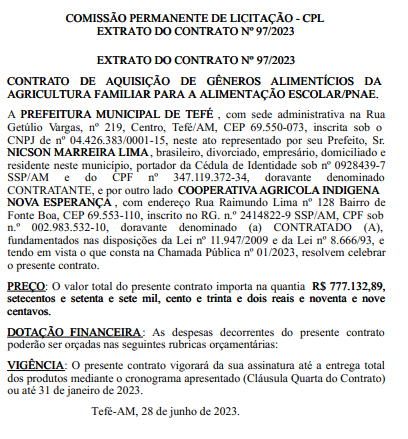O prefeito Nicson Lima, resolve contratar diversas empresas para o fornecimento de gêneros alimentícios. Na publicação do edital, o prefeito assinou extratos para cerca de 35 empresas. Os valores dos contratos somam o valor total de R$ 1.035.748,21 (um milhão, trinta e cinco mil, setecentos e quarenta e oito reais e vinte e um centavos.)