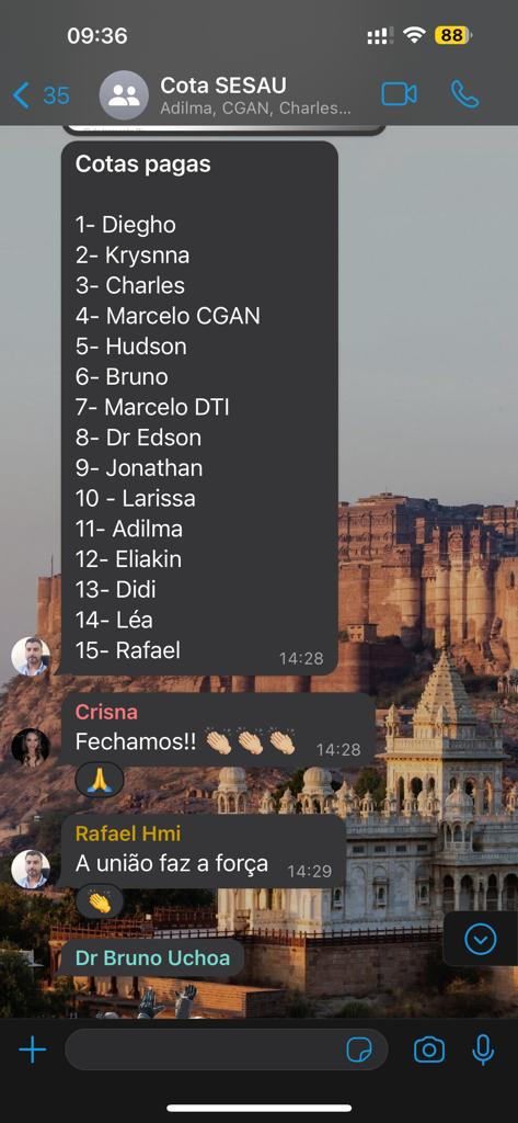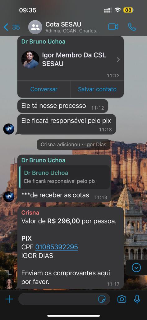 A “vaquinha” foi liderada por Bruno Uchoa, que criou um grupo de WhatsApp determinando que cada pessoa deveria pagar R$ 296,00 à conta de Igor. Ela pede ainda que os comprovantes sejam enviados no grupo.
