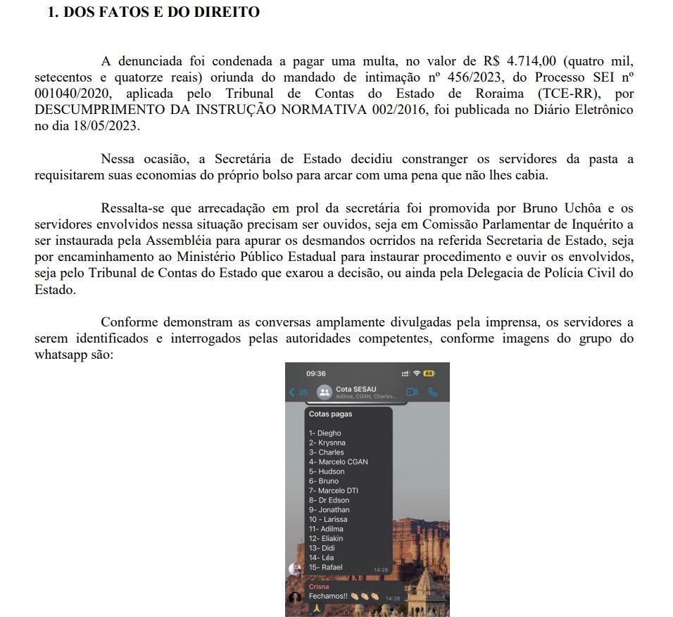 O  Ministério Público recebeu denúncia contra a titular da Secretaria de Saúde de Roraima (Sesau), Cecília Lorenzon, pedindo a quebra de sigilo telefônico e telemático por coagir os servidores da pasta a participar de uma “vaquinha” para pagar multa da aliada do governador Antonio Denarium no Tribunal de Contas do Estado. Os servidores que participaram da “vaquinha” também tiveram a quebra de sigilos pedida, conforme documentos que o Portal do Alex Braga teve acesso com exclusividade nesta terça=feira (5).
