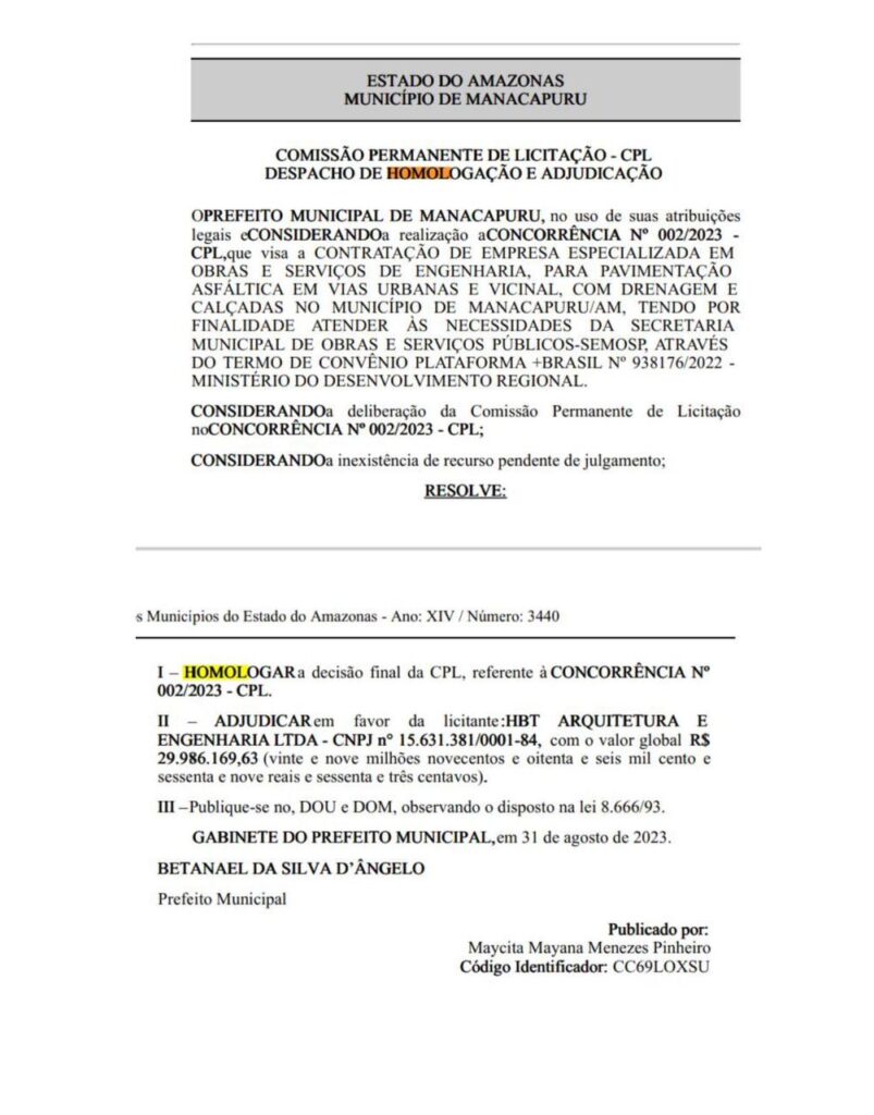 O valor total é de R$ 29.986.169,56 (vinte e nove milhões, novecentos e oitenta e seis mil, cento e sessenta e nove reais e cinquenta e seis centavos). O documento está publicado no Diário Oficial da Associação Amazonense dos Municípios (AMM), no dia 1 de setembro de 2023.
