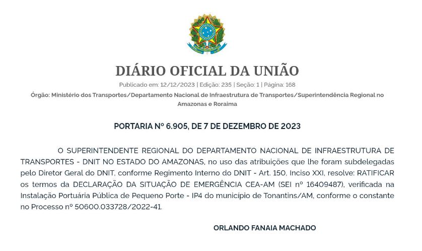 O Departamento Nacional de Infraestrutura de Transportes (DNIT) publicou duas portarias na edição de terça-feira (12), d Diário Oficial da União (DOU), que declaram situação de emergência em portos no Amazonas.