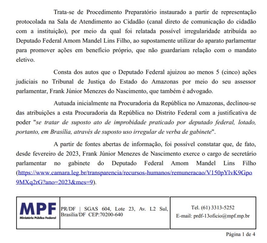 O deputado federal Amom Mandel (Cidadania-AM) foi notificado junto ao Ministério Público Federal (MPF), e será investigado após denúncia apontar que o parlamentar contratou para o seu gabinete o próprio advogado particular com uso de verba pública.