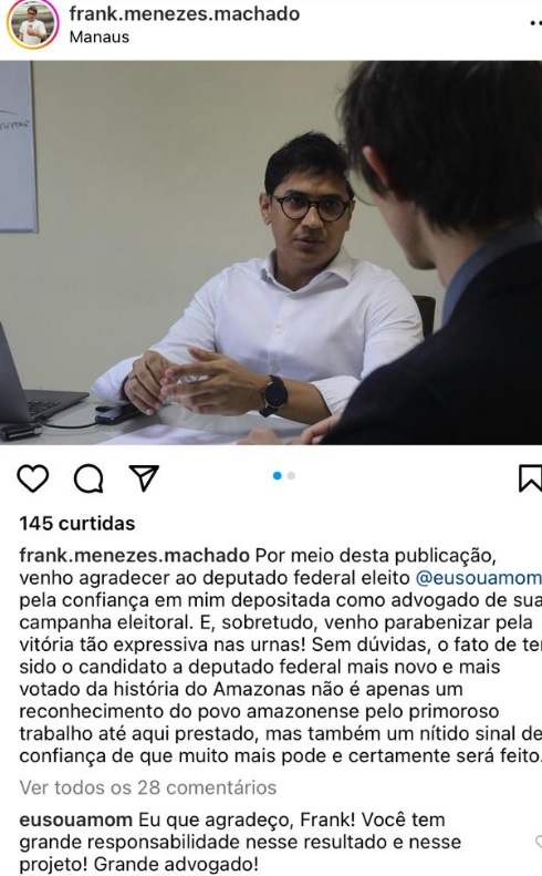 A atuação de Frank Menezes como advogado particular do deputado federal Amom Mandel Lins Filho no ano de 2023, se deu em ocasiões pontuais, de forma totalmente privada, com contratos, notas fiscais e comprovantes de pagamento por meio de transferência eletrônica devidamente apresentados ao MPF.
