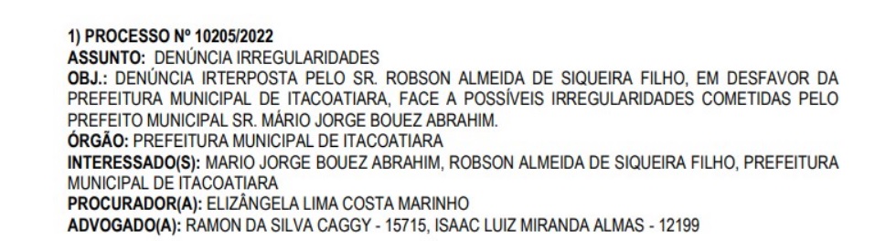 No diário oficial do TCE aparece o processo Nº 10205/2022, onde uma notícia do suposto crime aponta que a irregularidade teria ocorrido em abril de 2021, usando como justificativa o período emergencial na cidade.