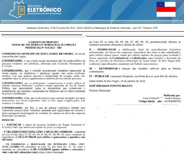 A decisão de não publicar o documento no diário da Associação Amazonense de Municípios (AAM), que é uma prática comumente adotada para garantir a transparência em processos licitatórios, levanta ainda mais questionamentos, questionamentos esses feitos pelo Portal Alex Braga à prefeitura de Santa Isabel, que não foram respondidos até o presente momento.