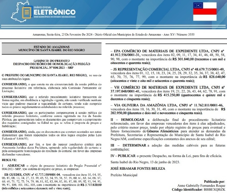 O prefeito de Santa Isabel do Rio Negro, José Ribamar Fontes Beleza (União Brasil), mais conhecido como Beleza, pretende gastar uma quantia significativa de mais de R$ 5 milhões para o fornecimento de gêneros alimentícios para atender o executivo municipal. O contrato, que foi homologado por meio do Pregão Presencial nº 004/2023, beneficiará as empresas EB Guedes; EPA Comércio de Materiais de Expediente Ltda; JS Representação Comercial Ltda; VH Comércio de Materiais de Expediente Ltda e Via Oliveira da Amazônia Ltda.