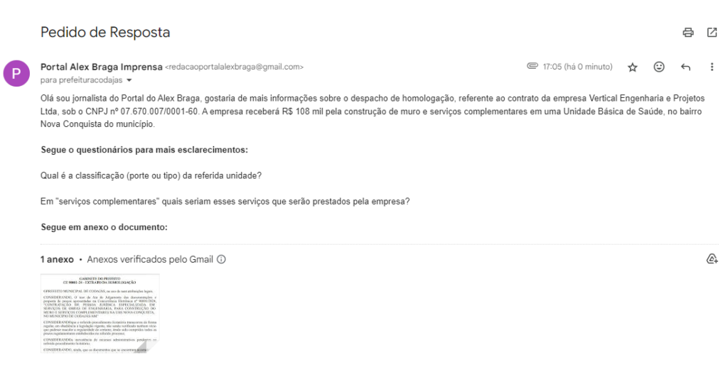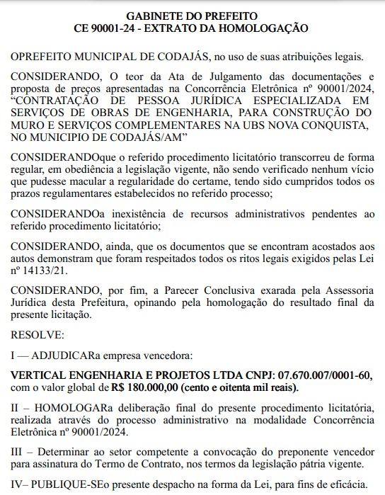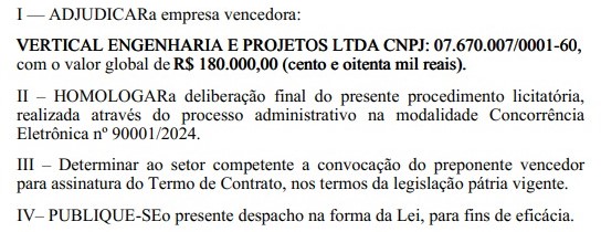 O despacho de homologação publicado concedeu vitória a empresa Vertical Engenharia e Projetos Ltda, inscrita no CNPJ nº 07.670.007/0001-60. Segundo o contrato, a empresa receberá por parte da prefeitura R$ 108 mil para construir muro e realizar serviços completares em Unidade Básica de Saúde (UBS), localizada no bairro Nova Conquista no município.