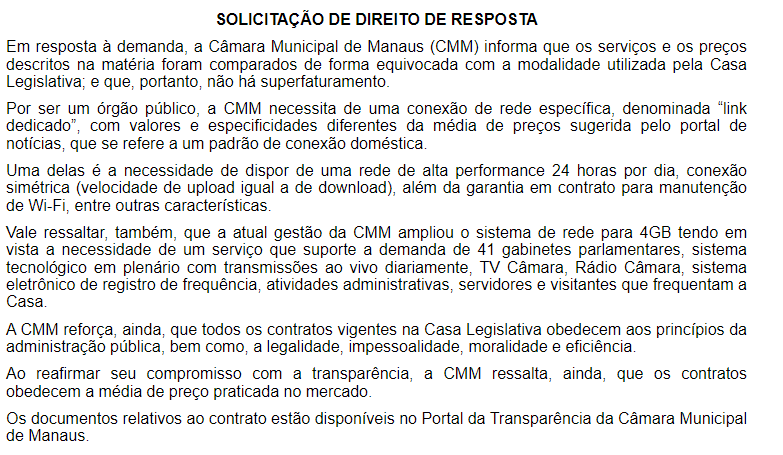 A Câmara Municipal de Manaus (CMM), solicitou ao Portal Alex Braga um direito de resposta três dias depois da matéria publicada, mesmo sendo notificada sobre os movimentos da construção da matéria.