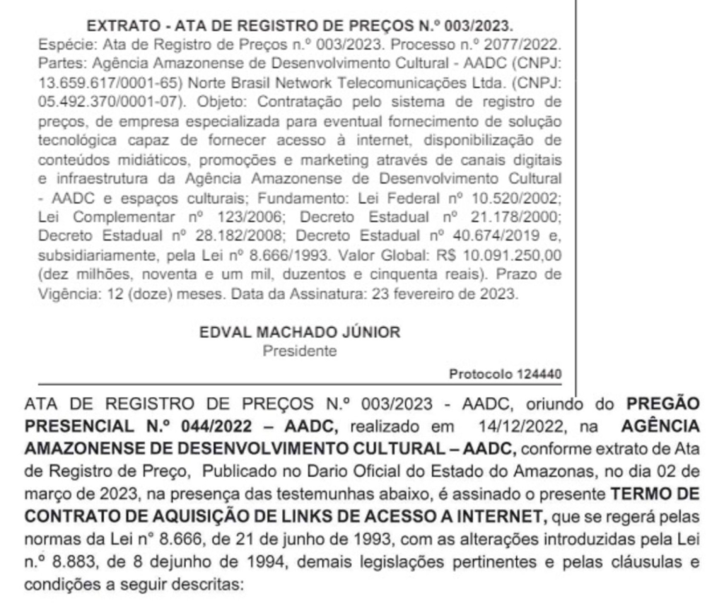 O que não é possível verificar neste contrato publicado pela Câmara Municipal que aderiu a um contrato da Agencia Amazonense de Desenvolvimento Cultural (AADC) do governo do Estado, que o valor do contrato é de mais de R$ 10 milhões, a Câmara aderiu por pouco mais de R$ 1 milhão o que já caracterizaria uma manipulação suspeita.