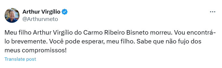 Morreu na manhã desta terça-feira (28), em Manaus, o ex-deputado federal Arthur Bisneto, filho do ex-senador e prefeito de Manaus, Arthur Neto. O ex-prefeito confirmou a morte agora há pouco pelo X, o antigo Twitter.